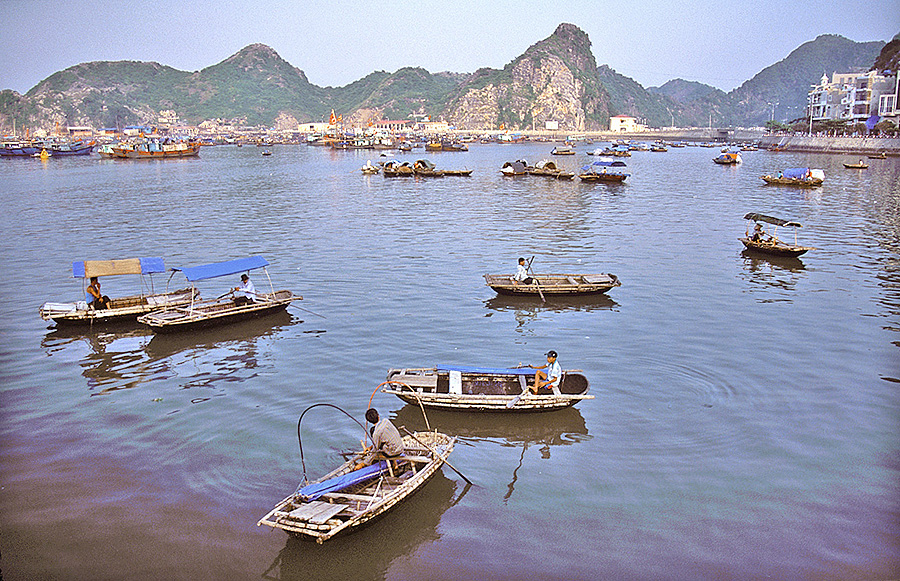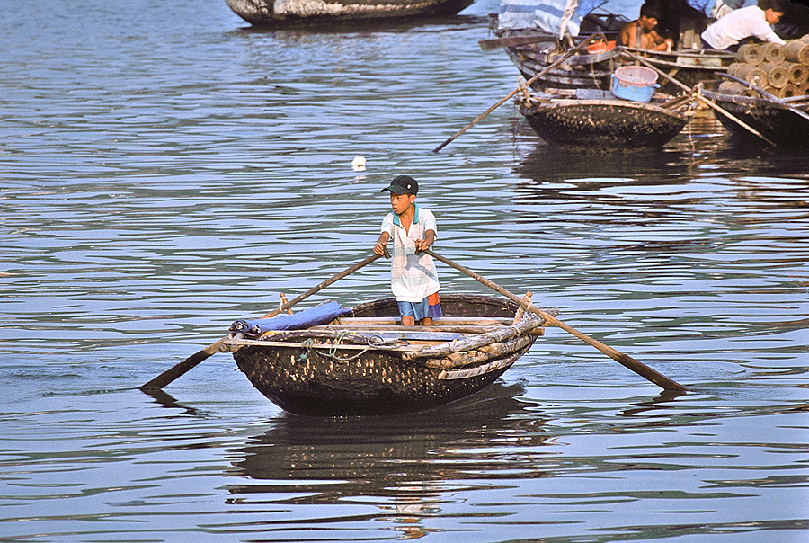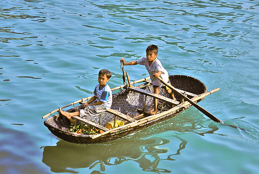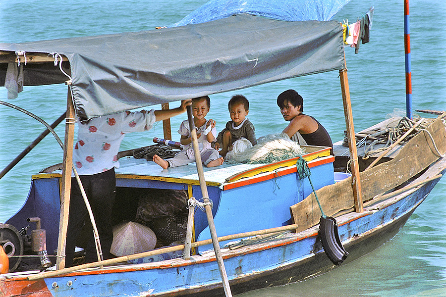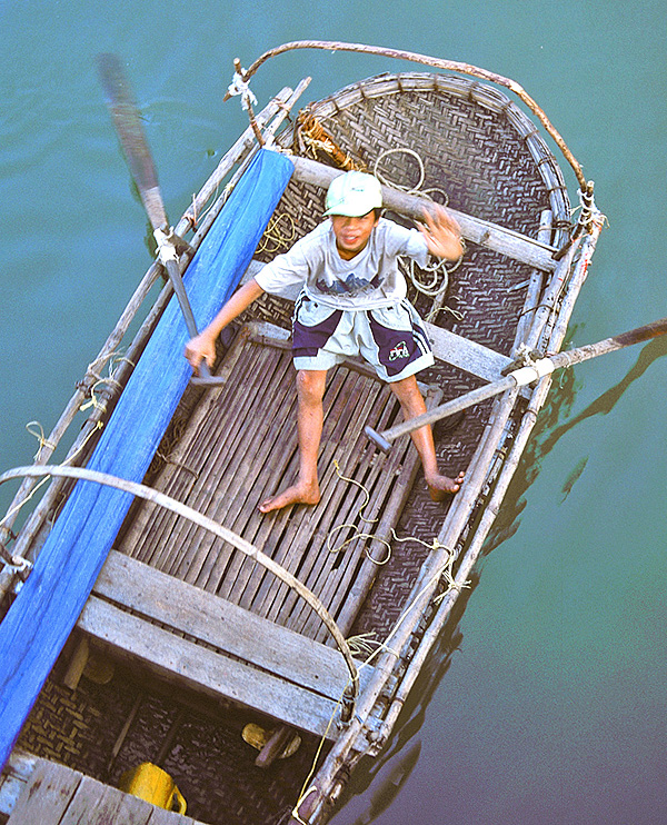 while floating around the bay in their tiny watercraft - Halong Bay, North Vietnam |