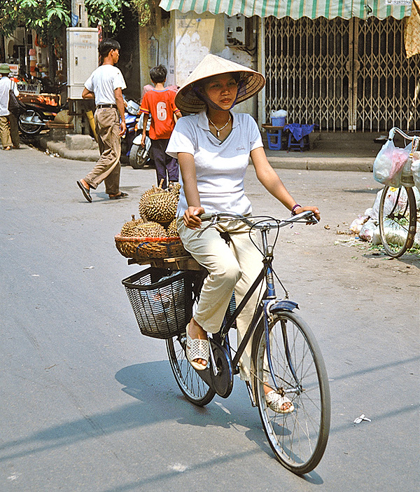 are ideal for bikes; this woman is transporting the infamous durian fruit