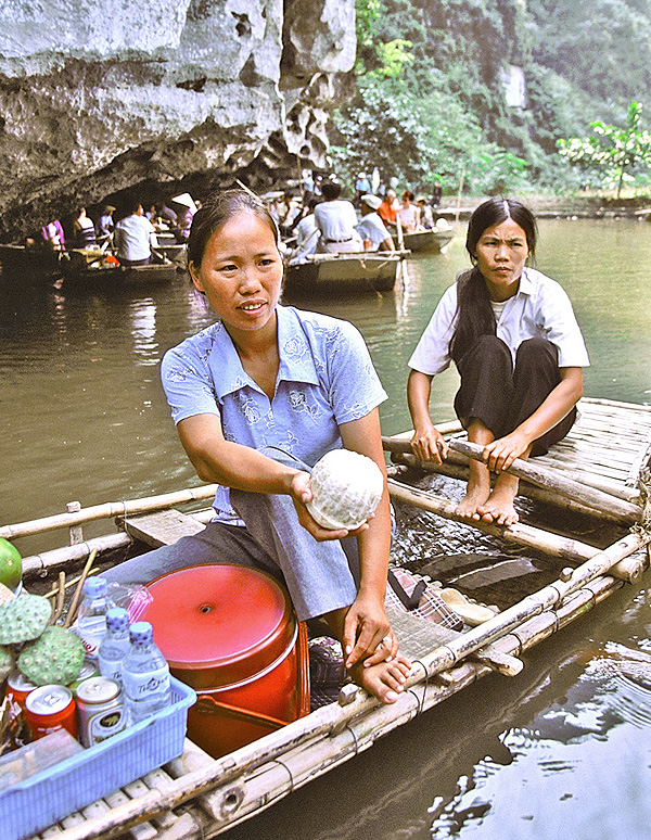 tourists are rowed by a single, tiny Vietnamese woman. I volunteered to row and, in spite of my whitewater canoeing experience, found it rather difficult to move our tourist-laden boat - especially since the oars are "pushed" rather than "pulled" - Perfume Pagoda (Chua Huong), North Vietnam |