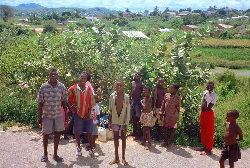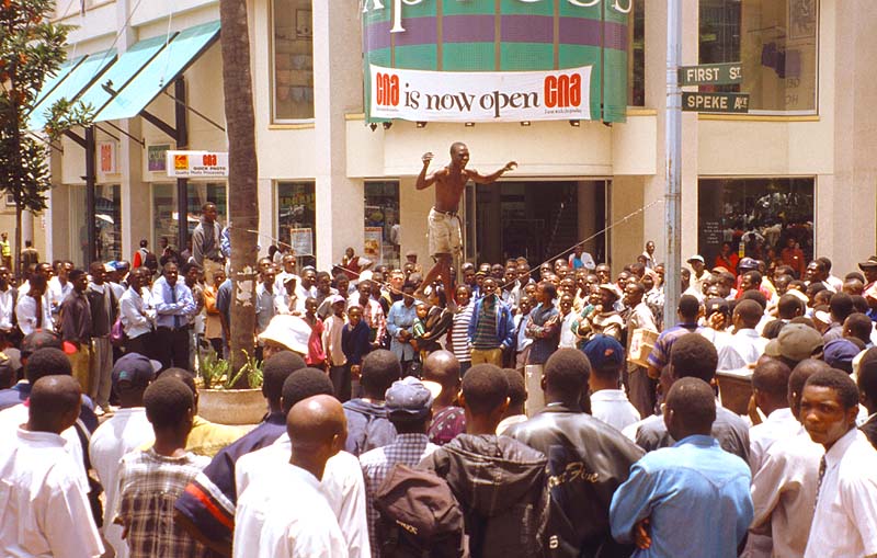 a railroad tie with his teeth before he acrobatically moved about on this steel wire as thin as a clothesline! After completing his routine, the Zimbabwean discriminated wisely - with the full attention of the audience, he rushed up to the three whites in the crowd (me and two Icelandic travelers) to collect "donations" for his performance - Harare, Zimbabwe |