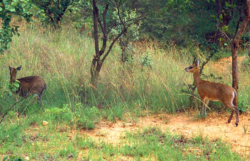 are adapted to the rocky terrain, and they always walk around on the toes of their hoofs like ballerinas (see the back hoofs of the klipspringer at right) - Matobo N.P., Zimbabwe |